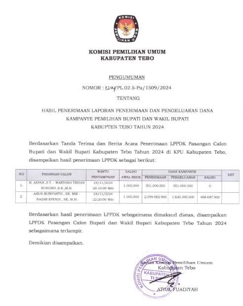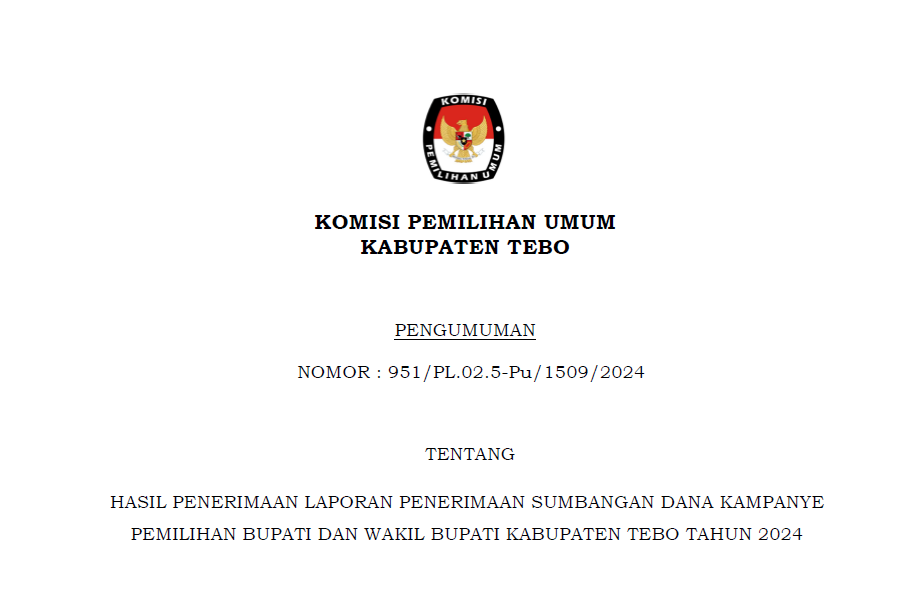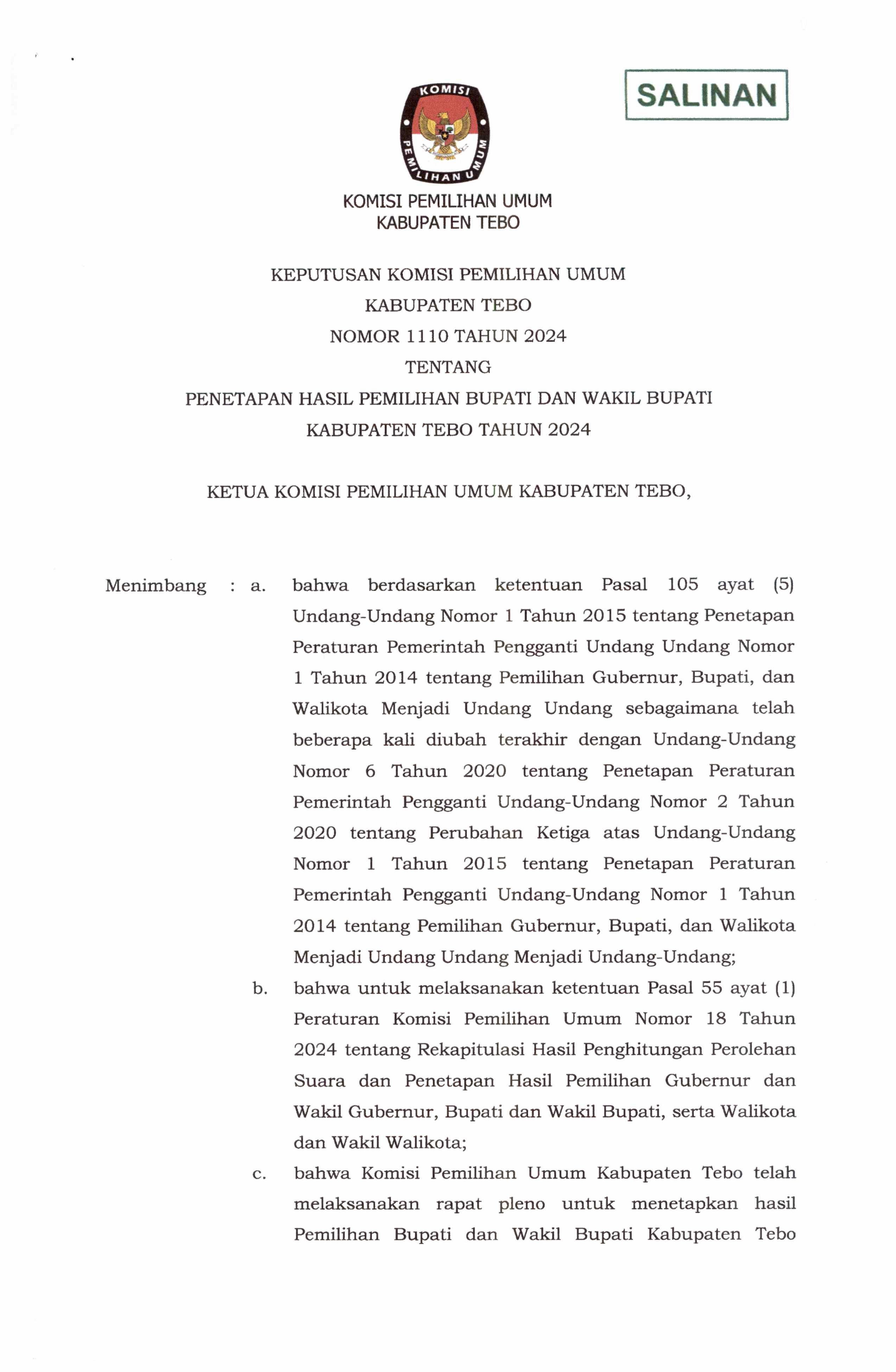 KEPUTUSAN KPU KABUPATEN TEBO TENTANG PENETAPAN HASIL PEMILIHAN BUPATI DAN WAKIL BUPATI KABUPATEN TEBO TAHUN 2024