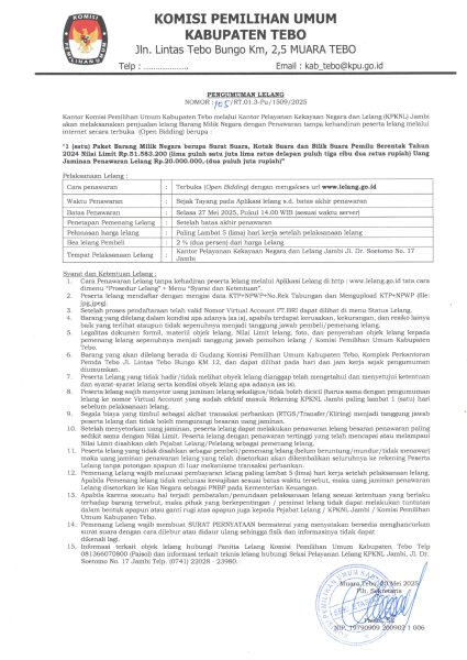 PENGUMUMAN LELANG NOMOR : 179/RT.01.3-Pu/1509/2025   Kantor KPU Kabupaten Tebo melalui Kantor Pelayanan Kekayaan Negara dan Lelang (KPKNL) Jambi akan melaksanakan penjualan lelang Barang Milik Negara dengan Penawaran tanpa kehadiran peserta lelang melalui internet secara terbuka (Open Bidding) berupa : 1 Paket Barang Milik Negara berupa Surat Suara, Kotak Suara dan Bilik Suara PemilIhan Serentak Tahun 2024 nilai limit Rp. 7.142.400.- (Tujuh juta seratus empat puluh dua ribu empat ratus rupiah) Uang Jaminan Penawaran lelang Rp 1.500.000.- (Satu juta lima ratus ribu rupiah). Batas Waktu Penawaran 27 Agustus 2025, Pukul 10.50 WIB (waktu server) Terbuka (Open Bidding) dengan mengakses url www.lelang.go.id Info selengkapnya silahkan klik unduh dokumen : >>>UNDUH DOKUMEN<<<