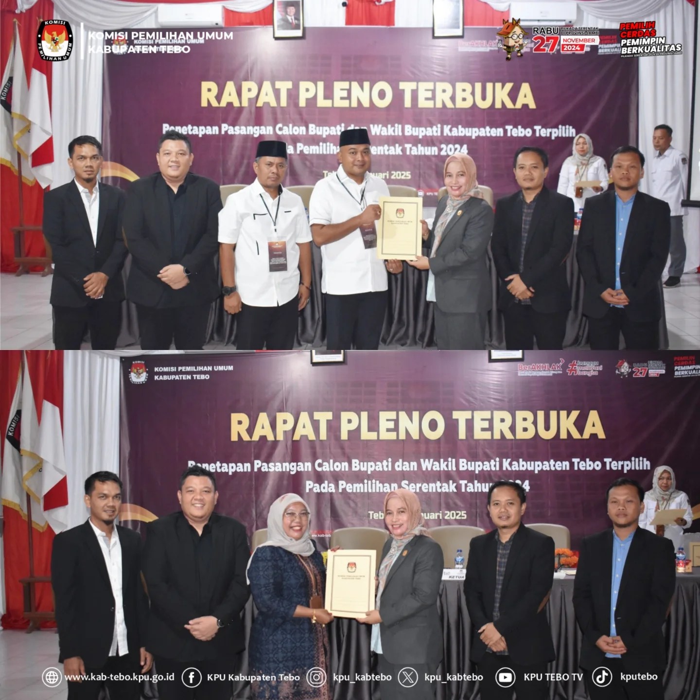 KPU Kabupaten Tebo Menetapkan Pasangan Calon Nomor Urut 02 (Dua) yaitu Bapak Agus Rubiyanto, S.E.,M.M dan Bapak Nazar Efendi, S.E., M.Si sebagai Bupati dan Wakil Bupati Kabupaten Tebo Terpilih periode 2025 - 2030.