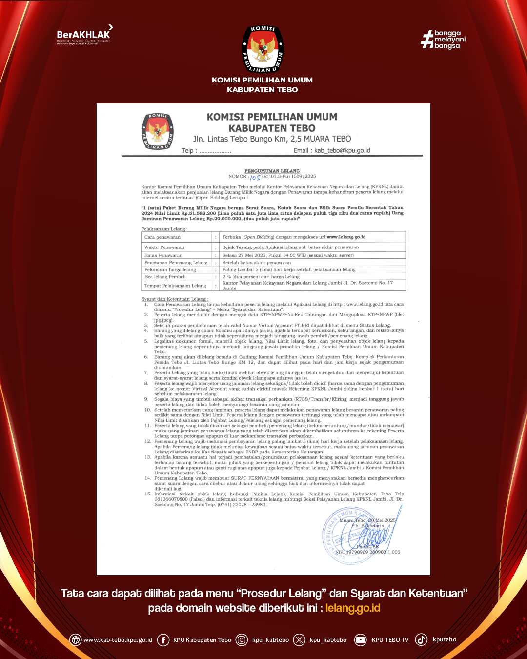 PENGUMUMAN LELANG BMN BERUPA LOGISTIK PASCA PEMILU SERENTAK TAHUN 2024 KPU KABUPATEN TEBO