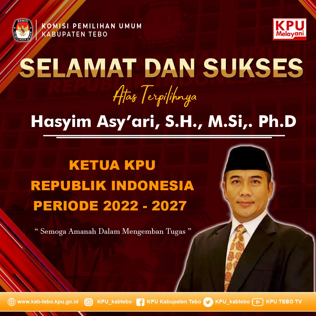 Keluarga Besar KPU Kabupaten Tebo mengucapkan selamat atas terpilihnya Bapak Asyim Asy'ari, SH.H., M.Si., Ph.D sebagai Ketua KPU RI dengan masa jabatan 2022-2027. Semoga amanah dalam mengemban tugas.