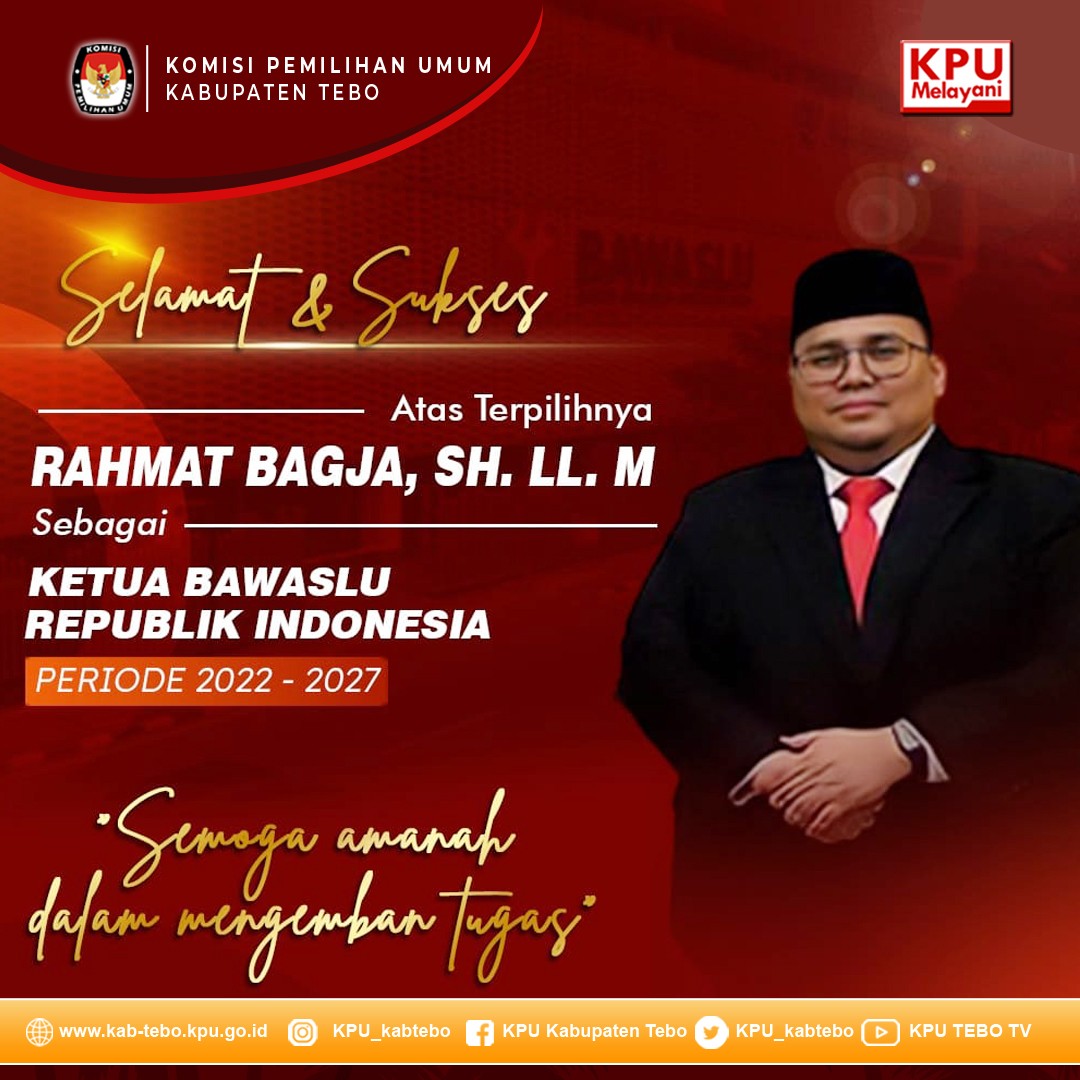 Keluarga Besar KPU Kabupaten Tebo mengucapkan selamat atas terpilihnya Bapak Rahmat Bagja, SH. LL. M sebagai Ketua BAWASLU Republik Indonesia periode 2022-2027. Semoga amanah dalam mengemban tugas.
