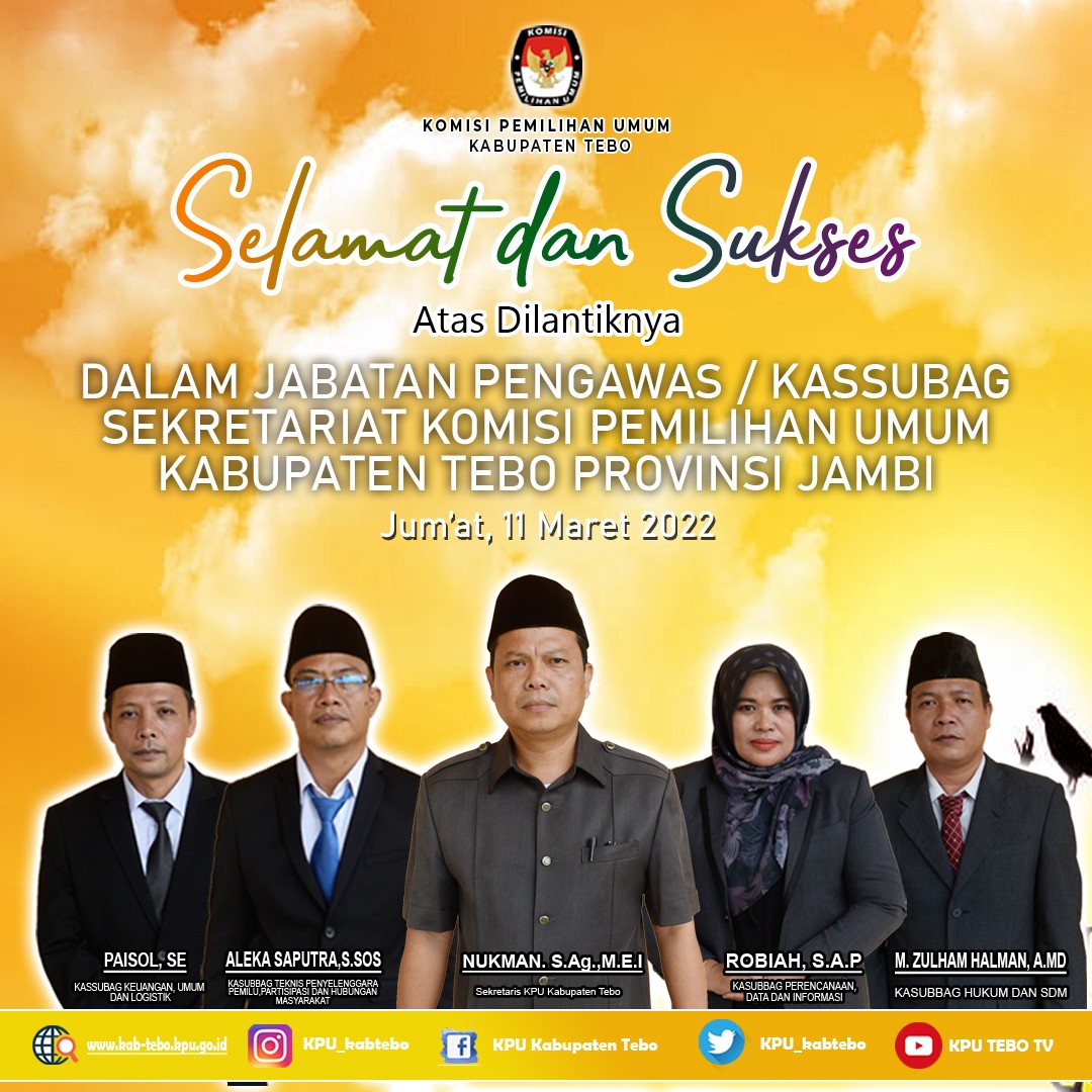 Segenap Keluarga Besar Komisi Pemilihan Umum Kabupaten Tebo mengucapkan Selamat dan Sukses atas Pelantikan dan Pengambilan Sumpah/Janji Jabatan Kepala Sub Bagian pada Sekretariat Komisi Pemilihan Umum Kabupaten Tebo kepada 4 Kepala Sub Bagian yang dilantik :