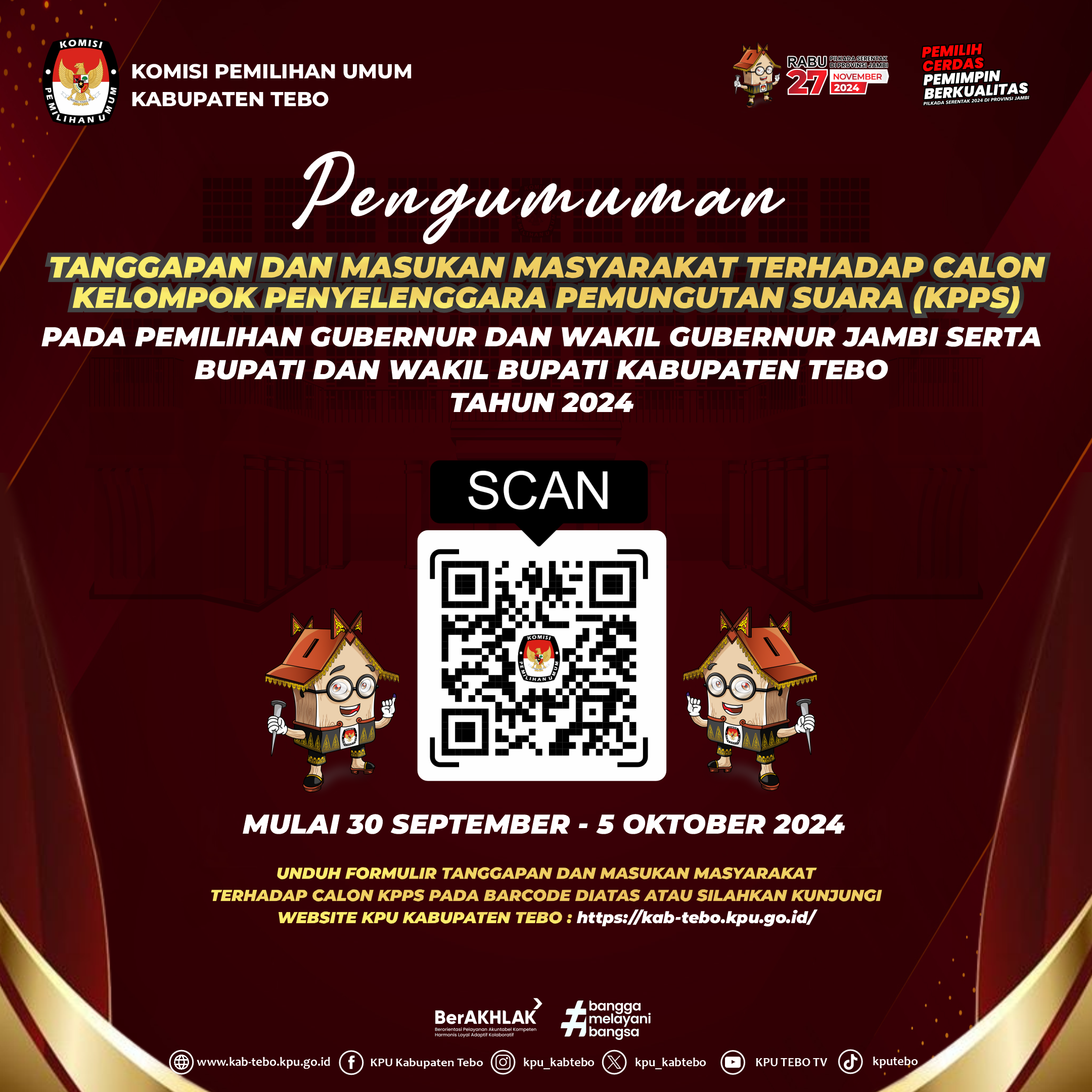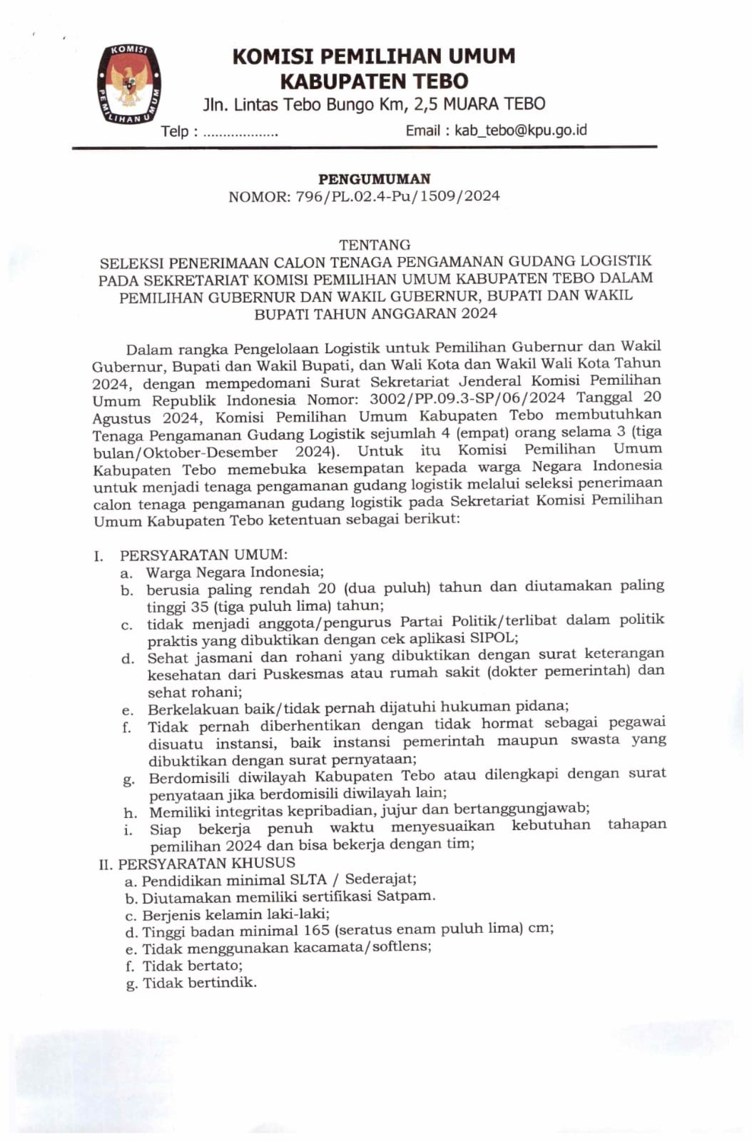 Pengumuman tentang Seleksi Penerimaan Calon Pengamanan Gudang Logistik pada Sekretariat KPU Kabupateb Tebo dalam Pemiliham Gubernur dan Wakil Gubernur, Bupati dan Wakil Bupati Tahun 2024.