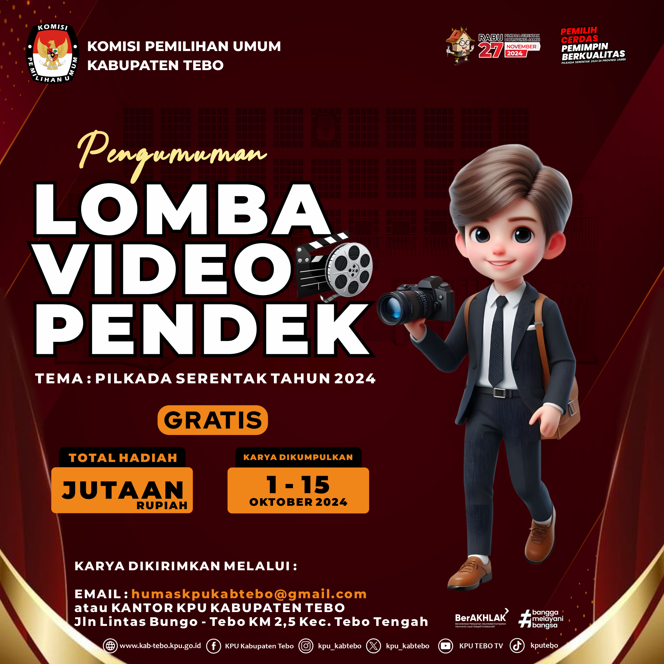 KPU KABUPATEN TEBO TELAH MEMBUKA PERLOMBAAN VIDEO PENDEK DENGAN TEMA PEMILIHAN SERENTAK TAHUN 2024 DI PROVINSI JAMBI KHUSUSNYA KABUPATEN TEBO.