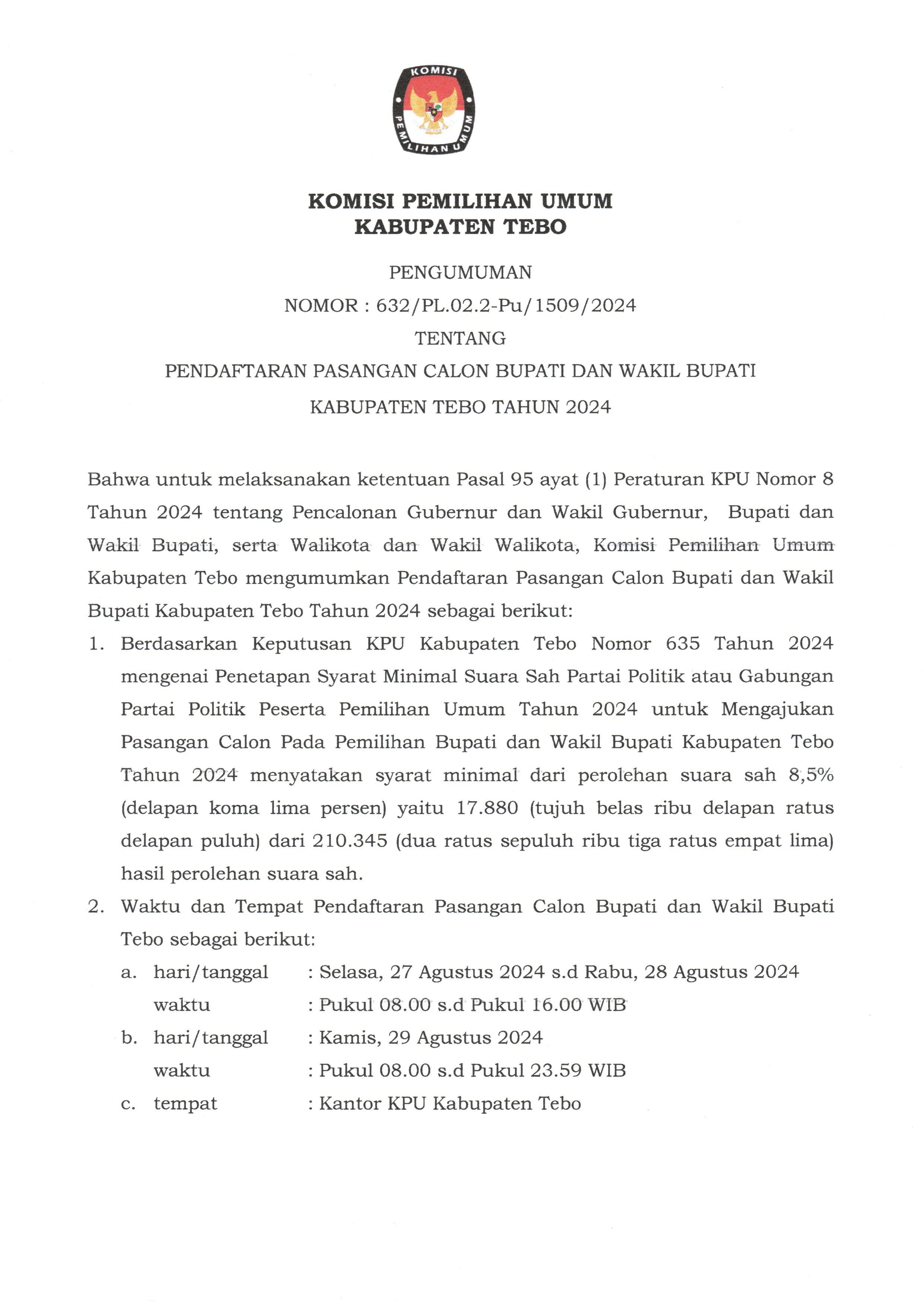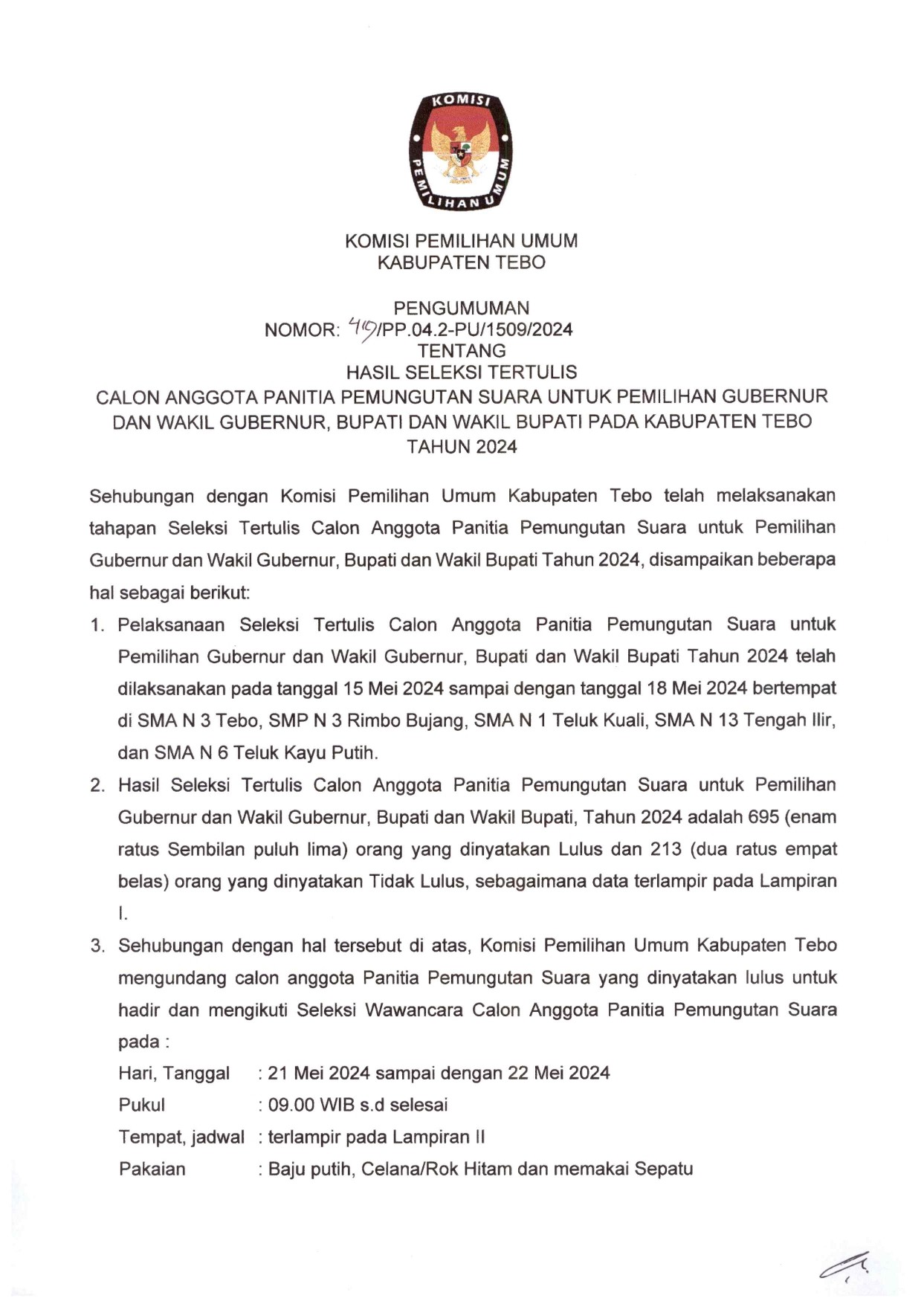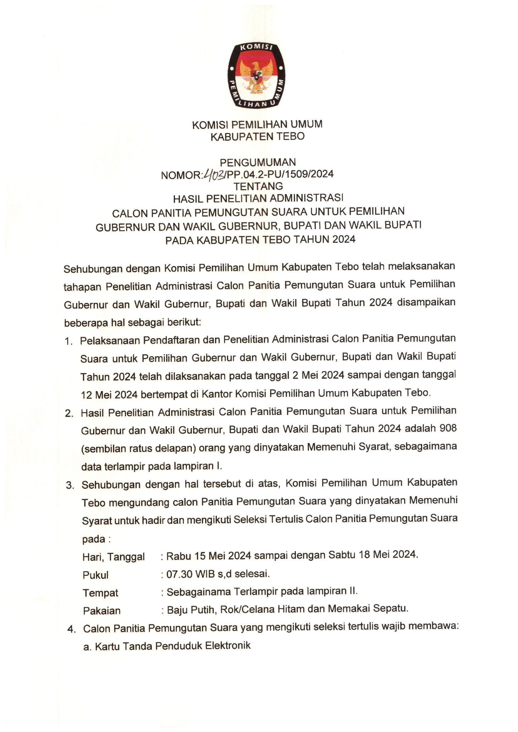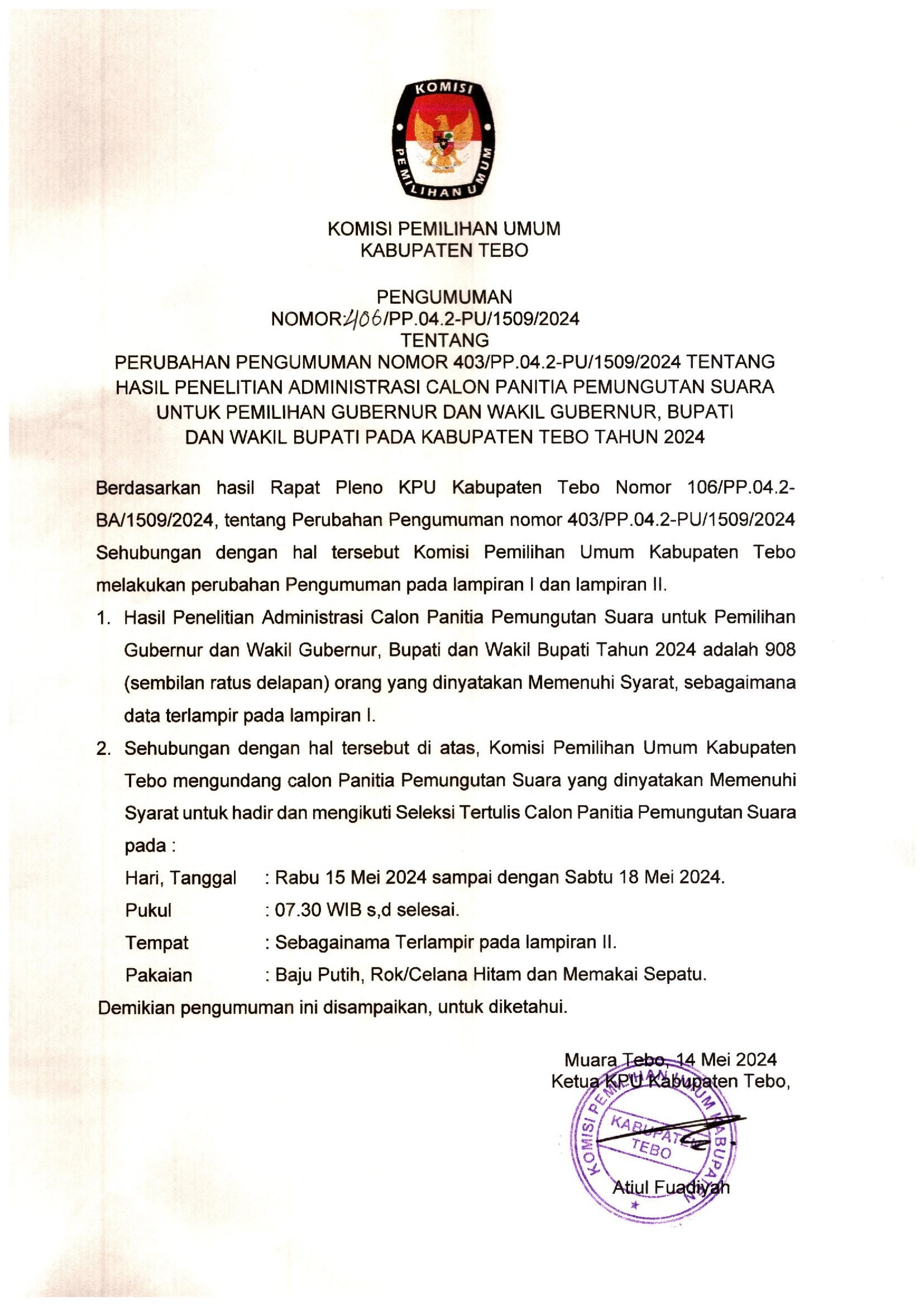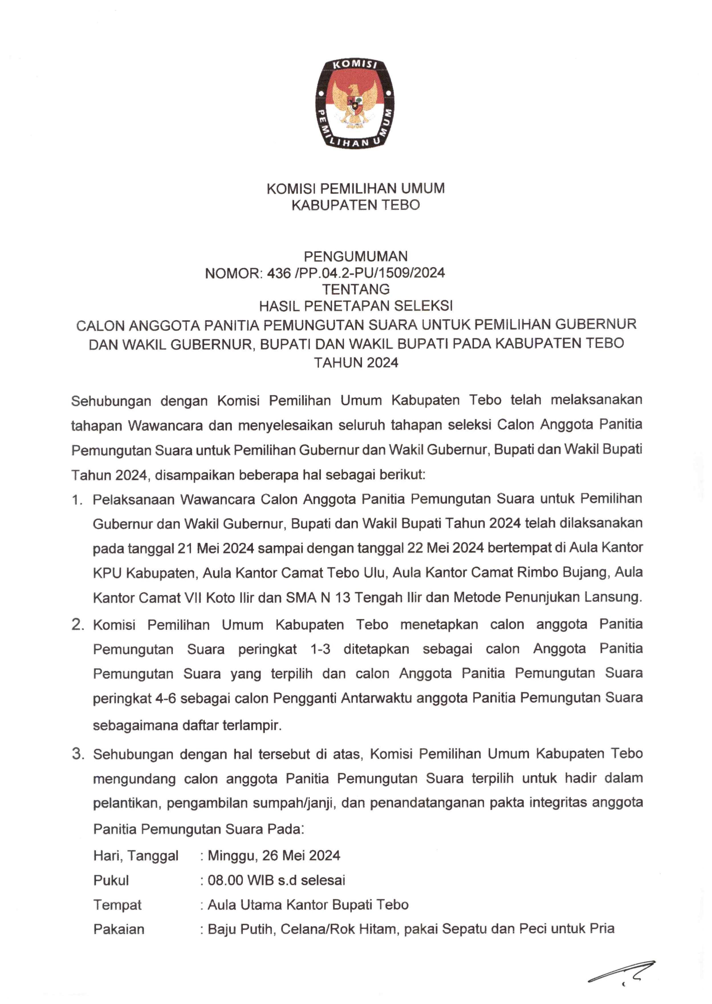 Pengumuman Nomor :436/PP.04.2-PU/1509/2024 tentang Hasil Penetapan Seleksi Calon Anggota Panitia Pemungutan Suara (PPS) untuk Pemilihan Gubernur dan Wakil Gubernur Provinsi Jambi, Bupati dan Wakil Bupati Kabupaten Tebo Tahun 2024, adapun pelantikan, pengambilan sumpah/janji, dan penandatanganan pakta integritas dilakukan pada tanggal 26 Mei 2024 pukul 08.00 WIB, bertempat di Aula Utama Kantor Bupati Tebo .